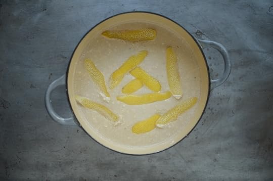 Using a vegetable peeler, take strips of peel off the lemon (avoiding going too deeply. You don't want the white pith). Add the strips to the pot, along with a pinch of salt.