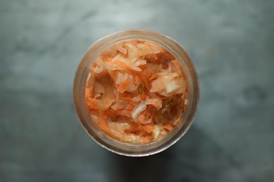 It’s been bubbling on my dining room table (since it’s a ceramic crock, there’s no worry about sunlight). I’ve already snuck a taste and even young and half-fermented, and it’s delicious. Perfect for eating alongside breakfast.