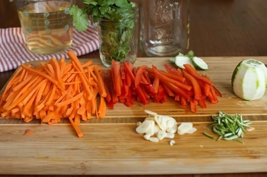 6 cups cucumber slices (shoot for about 1/2 inch slices)2 cups sliced red peppers (about 2 peppers)