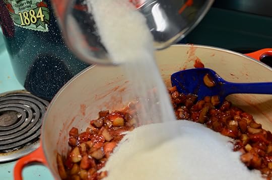 Once the tomatoes and apples are prepped, the rest of the ingredients join them in the pot. Then, you put the pot on the stove over high heat, bring it to a rolling boil, reduce the heat to medium-high and cook the chutney until it has reduced by about half.