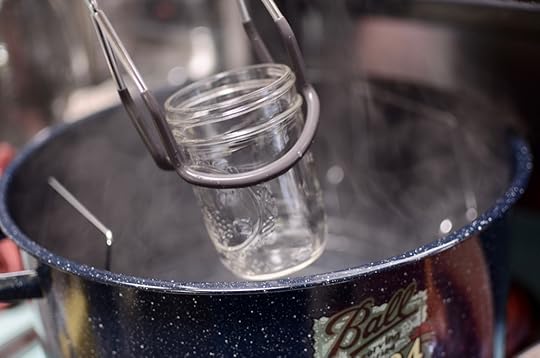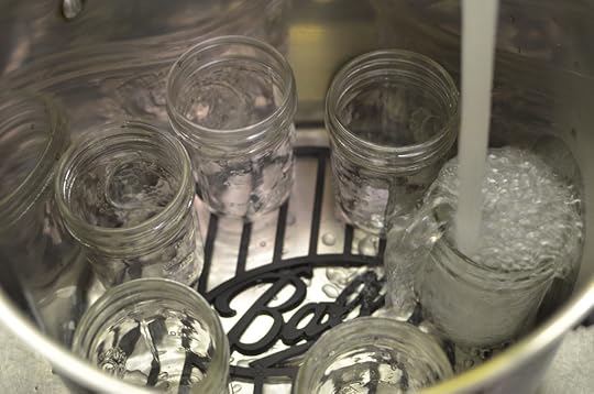Arrange the necessary half pint jars on top of the mat or rack and fill them with hot tap water. Keep the water running until the jars are just submerged. If you have hard water, add a healthy glug of white vinegar to the pot to help prevent mineral deposits from adhering to your jars.