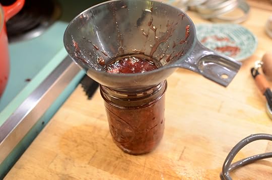 Once the jelly is finished, it’s time to get it into the jars. Pull one of your hot jars out of the canner and put it on a heatproof surface (I like to work on my butcher block, because the wood absorbs the heat and doesn’t put the jars at risk).