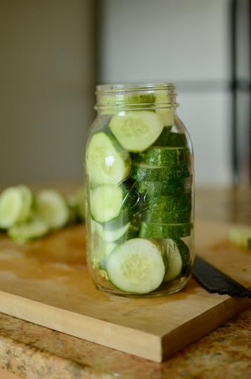 Remove one jar from the canning pot. Then, working quickly, pack the cucumber slices into the jar, fill it with the hot brine to 1/2 inch headspace, and wiggle out the air bubbles (top with more brine if the level has dropped below 1/2 inch).