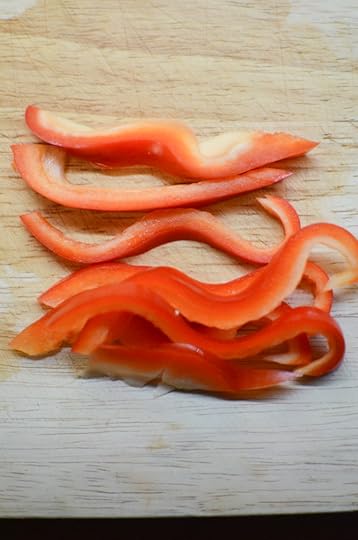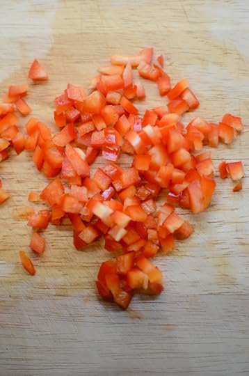 I made this pepper jelly over the course of two days. The first day, I gathered my peppers and carefully chopped them into tiny squares. You could use a food processor for this job, but I find the process of making a teeny, uniform dice quite soothing.