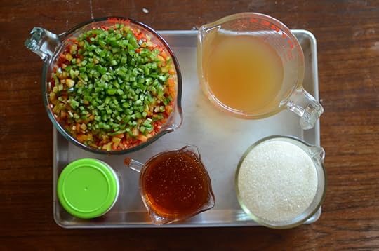 The next day, I took my carefully chopped peppers out of the fridge and gathered the rest of my ingredients. In addition to five cups of peppers (1/2 cup are hot), you need 1 1/4 cups apple cider vinegar, 2 cups granulated sugar, 1 cup honey, and 3 tablespoons of Ball Low or No-Sugar-Needed Pectin.