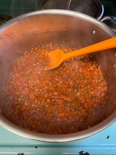 In a large pot (I used a low, wide 8 quart pan made from stainless steel), combine the peppers and vinegar. Bring them to a hard boil and stir in the pectin, one tablespoon at a time. Then, add the sugar and honey. Once all the ingredients are in, you let it boil hard for three minutes, and then the cooking process is done.