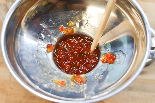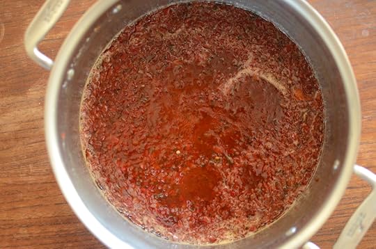 Once your apples are chopped, you start working on the tomatoes. The recipe instructs you to peel and seed them before chopping. My tomatoes were too soft to peel easily, so I did my best with the peels and seeds, but didn’t try to be absolutely perfect.