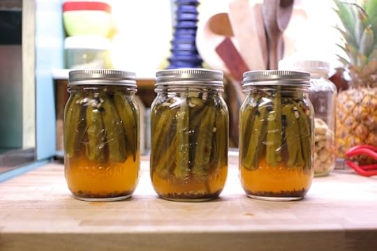 Now, before you wrinkle your nose and announce that you don’t like okra, know that pickling it reduces its slime factor quite radically. I find that people who normally dislike okra find much to appreciate about the pickled version. Even my mother, who is disinterested in okra on a good day, can really dig into a jar of the pickled version. I highly recommend that you try it.