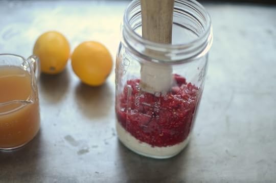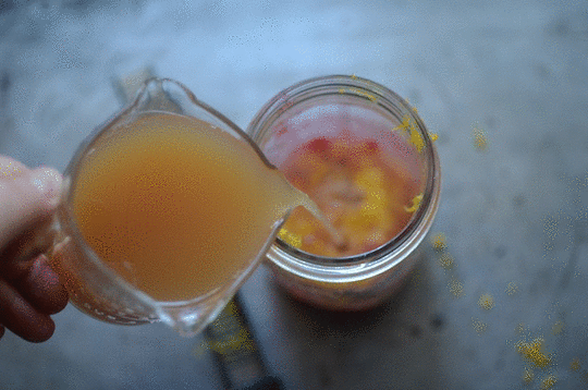 The next day, pull the jar out of the fridge. Give it a good stir to make sure that all the sugar has dissolved into the fruit juice.