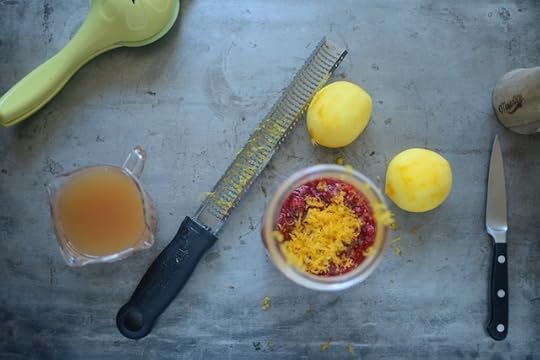 Once the berries are well smashed into the sugar, you zest 2 meyer lemons into the jar.
