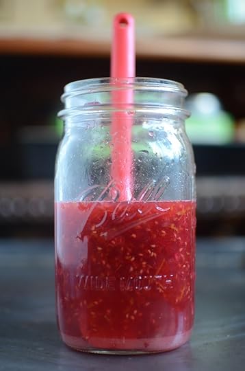 This is an uncooked shrub and you start simply by muddling 6 ounces of raspberries and 8 ounces of granulated sugar together (I love my Masontops Pickle Packer for this task).