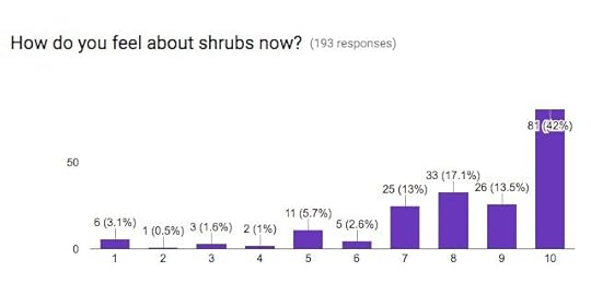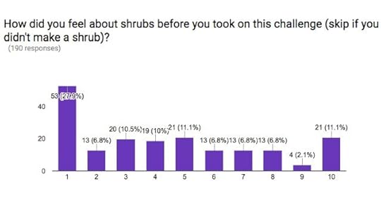 Much like last month, there was a lot to choose from within the challenge parameters. I was surprised and delighted that so many people took on shrubs. As you’ll see in the satisfaction numbers further down, I feel like this month turned a lot of shrub-skeptics into shrub lovers (though not all of you loved the shrubs. And that’s okay too!).