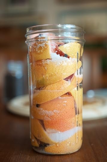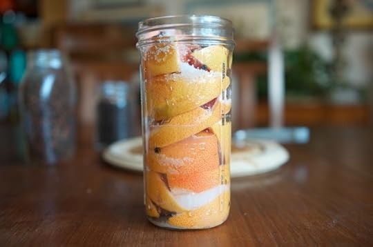 Once the jar was full, I pressed gently on the top to ensure that the salt was going to start dissolving and give me plenty of juice. I’ll let this sit on the countertop for the next week or so, until the grapefruit pieces are entirely covered with juice and they’ve started to soften and develop a pleasingly funky flavor. At that point, the jar will go into the fridge and I’ll start using these preserved grapefruit pieces to add flavor to dips, vinaigrettes, soups, and stews.