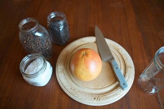 First, I gathered my ingredients. One hefty pink grapefruit. Some sea salt. And the spices that happened to catch my fancy this morning.
