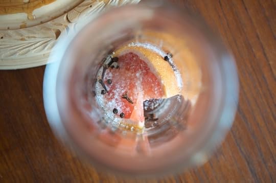 Then it was time to layer the grapefruit wedges. I took two pieces and snugged them into the bottom of the jar. I topped that with a teaspoon of salt, a few cloves and a couple black peppercorns.
