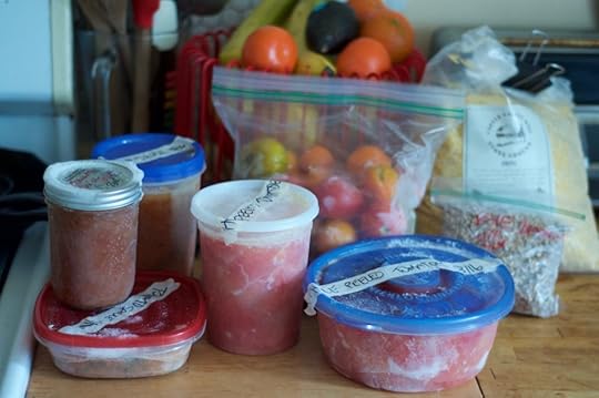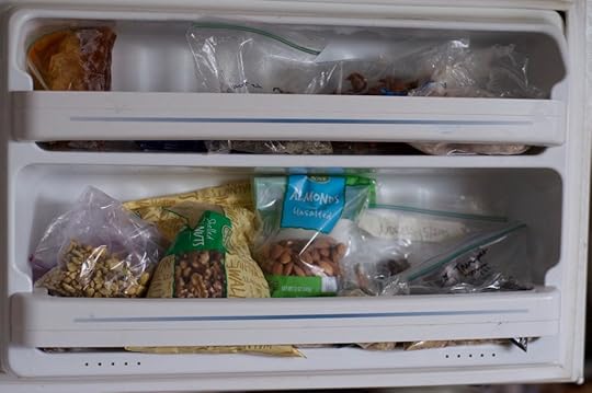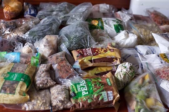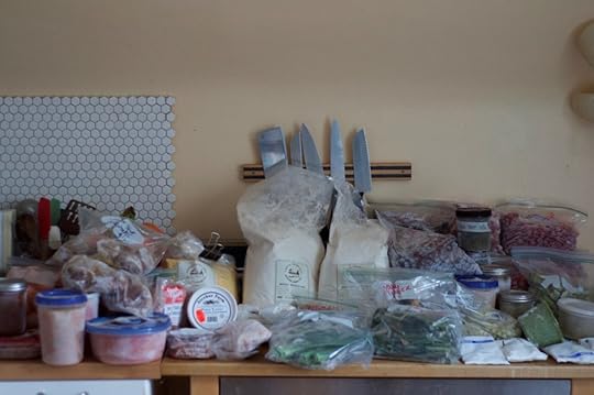 Then I stacked my gallon ziptops of precious local fruit one on top of the other by type, so that I wouldn’t wonder what lurked underneath without digging to the bottom, along with my big ten-pound bags of flour. Smaller bags of grains went on top of those, then bags of ginger, leeks, and parsley. I bagged up my cold packs to keep them together.