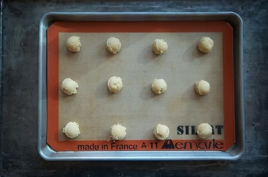 I used a tablespoon cookie scoop to portion out the dough and then used a wet fingertip to make them impressions (sometimes I use a melon baller for this task, but this dough was a little sticky for the task).