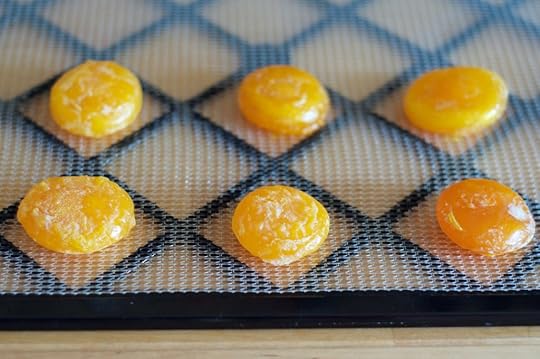 Place the rack with the yolks into the dehydrator or oven at 150 for one and a half to two and a half hours. You'll know the yolks are sufficiently dry when their texture and firmness resembles a hard-aged cheese.