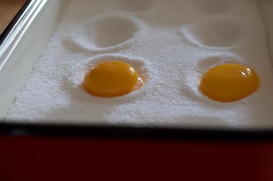 Pour half the salt and sugar mixture into a shallow pan (9"x13" for a full dozen yolks; an 8"x8" would probably work better for a half dozen). Spread the mixture evenly, then use the back of a spoon to create gentle, evenly spaced depressions in the curing mixture, one for each yolk. Carefully pour each yolk into your hand and then place each one into its own depression in the curing bed.