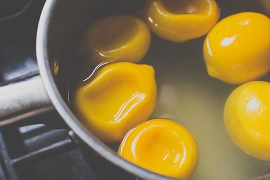 After rinsing the fruit, I arranged it in a pan that was wide enough to hold it in a single layer. Filled with twice as much filtered water as I needed for the recipe (to ensure that there would be enough after evaporation), it went on the stove and simmered for about 45 minutes, until the rinds could easily be pierced with a fork.