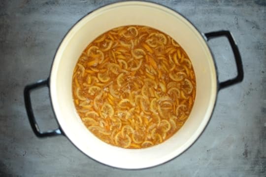 Cut and prepare the fruit*. Slice each piece lengthwise along the stem. Notch out the pith from the centers of the fruit, retaining those pithy centers so you can squeeze juice from them later**. Then, using a small bowl with a strainer suspended over it, run your thumbs along the insides of the notched fruit to remove any seeds while collecting the juice in the bowl. Squeeze the pithy centers over the strainer also. The goal is to collect as much juice as you can at the same time as you are preparing the fruit pieces for cooking. Set the bowl of juice aside.Cook the fruit. Place the cut fruit pieces in a big, nonreactive pot, and cover with cold water so they float freely. Bring to a boil, reduce the heat, and simmer until the skins are soft enough to pierce with a skewer***.Drain the fruit. (Keep the cooking liquid if you want to make it into syrup as a side project, which you can do by adding sugar at a 1:1 ratio and simmering for about ten minutes.)Combine the cooked fruit and the fresh juice from Step 1. Puree in a VitaMix or food processor, but don’t completely liquefy the mixture. Leaving small chunks of rind gives the finished jam a better texture.Transfer the fruit mixture to a large glass or ceramic bowl, measuring it out to see how many cups you have. Stir in one cup of sugar for each cup of puree. Cover the bowl tightly, and let it rest in the fridge overnight. (Honestly, you don’t have to wait if you don’t want to. If you want to keep right on cooking, go directly to the steps for Day Two. I usually break it up so I have time to do other things, like packing.)Sterilize your jars. You’ll have to guess at how many you need. It shouldn’t be more than ten half-pints.Transfer the fruit mixture to your jam pan (I use an 11-quart stainless steel or copper pan) and slowly bring to a boil, then reduce heat to medium and cook until the mixture reaches a jam-like consistency. Stir frequently to prevent sticking, and you may have to reduce the heat as the jam cooks down, so it doesn’t scorch. Mine usually takes 20 minutes or less. Look for the point at which excess liquid has evaporated from the top of the mixture and the bubbles become smaller and more settled. You’ll also probably start to see clear tracks at the bottom of the pan when you stir, and the surface will start to subtly crease. With all this citrus, you definitely won’t have trouble achieving a good set.Remove the jam from the heat. Pour the jam into hot jars, leaving 1/4-inch head space. Wipe the rims clean, apply lids, and process in a hot water bath for 5 minutes, adding time for your elevation if necessary.