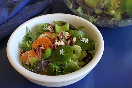 I did make some changes to the original recipe. I cut the amount of celery called for to reflect the amount I had. I replaced regular balsamic vinegar with golden, to keep the color bright. I added flowering miner’s lettuce from our yard and a handful of chopped pecans. This is one of the best things about salads; they invite play.