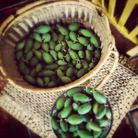 If you met a feijoa on the street, how would you say hello? You could greet it in Spanish (fay-ho-ah), Brazilian (Fay-zhwa), or as they do down under in Australia and New Zealand (fee-joe-ah). Or you could chuck all that and simply call it a pineapple guava. It will answer to any of these names and then happily offer itself to you so you can eat it up.