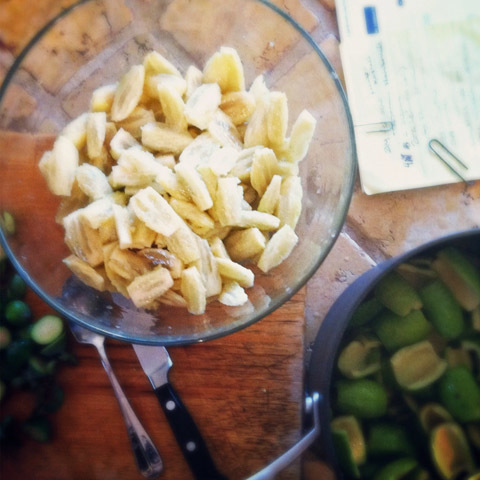 3. Make the feijoa juice by covering the peels with water until they are submerged by about 1 inch and simmering for 20 – 25 minutes. Strain out the peels. (You will have a lot more juice than you need. I think this is a good thing, because you can refrigerate or freeze that juice to make a wonderful feijoa syrup later; see below.) Add 1 cup of feijoa juice to the bowl with the rest of the ingredients, gently mix, cover tightly, and place in the fridge to macerate for about 24 hours.