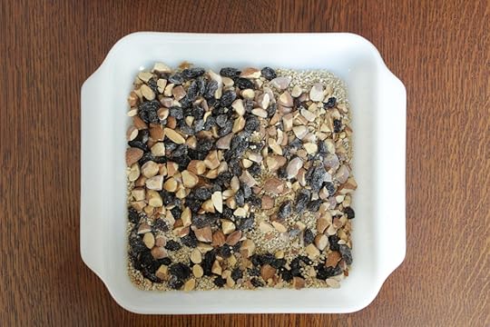 Preheat the oven to 375°F (if you're using convection, reduce heat by 25°).Combine the oats, nuts, baking powder, salt, and dried fruit in an 8x8 baking dish.