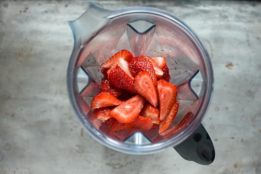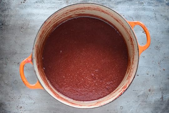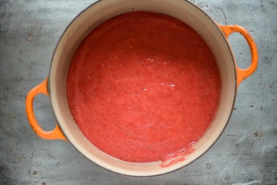 While the jars heat, you wash three pounds of strawberries, remove the hulls, and cut them into quarters. Then, you place the prepped berries in a food processor or blender and puree them until smooth. When you like the consistency, you pour the puree into a pot that’s large enough to contain the butter during a pretty vigorous boiling phase.