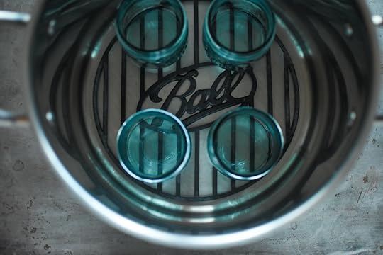 You start by getting your canning pot set up. I used the canning mat from the new Preserving Starter Kit and four of the new Vintage Aqua Jars in their half pint size (these jars really are so pretty). These Collector’s Edition mason jars feature a vintage design, color and logo originally produced between 1910 and 1935. The Ball® Aqua Vintage Jars are available in Quart, Pint and Half-Pint Sizes.