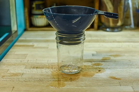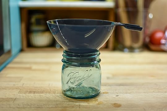 Once you like the consistency of the butter (it should stand tall and proud in the bowl of a spoon), it is done. Position a clean, wide mouth funnel in one of your previously prepared half pint jars and funnel in the butter, leaving 1/4 inch headspace (find all the necessary tools here).