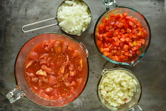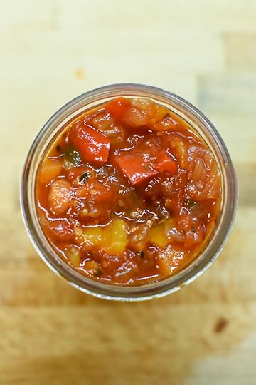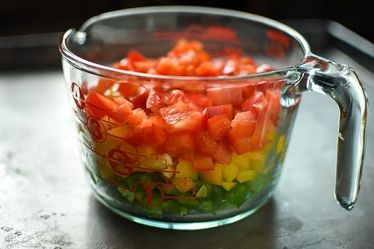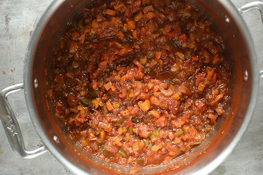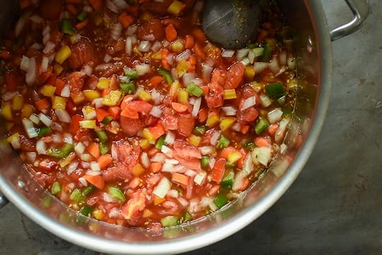 The bulk of the work of this relish happens on the front end and comes in the form of peeling and chopping. You peel and chop enough tomatoes make up about six cups (this took about three pounds of tomatoes for me), dice three multicolored peppers and a large onion, and slice up a couple carrots and a rib of celery. Click here for the exact proportion.