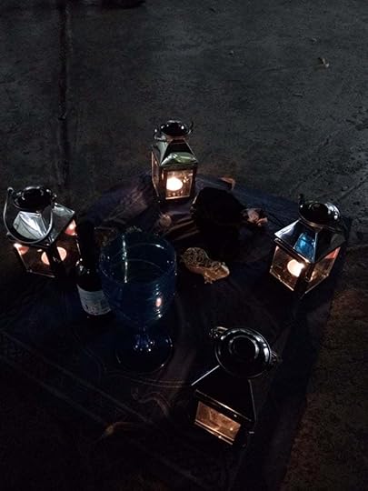 I like to have a focal point at the centre of a circle, and if it’s not going to be a fire, then a temporary altar makes sense. I started with the cloth from my Druid Animal Oracle Cards, which is perfect for this sort of thing. Four small candles in lanterns, because we needed some light, and because that’s a very small amount of fire in a safe and manageable way.