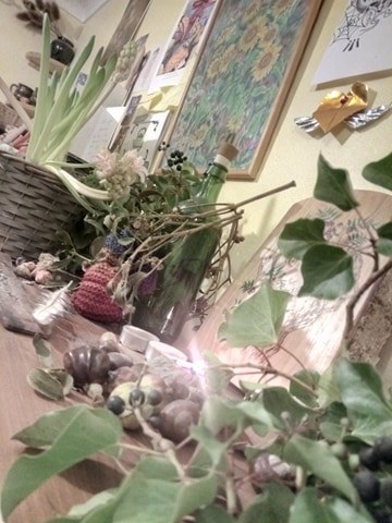 At the moment, the altar is messy – there’s ivy on it we took from a fallen tree, and there’s a sprawling bowl of hyacinths, the perfume from which fills the flat. It’s a chaotic space, and for the first time since we started, I feel like this is how it should be – a bit wild, excessive, and alive.