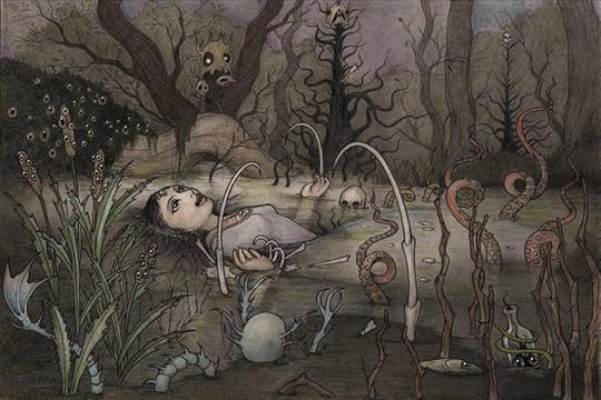 Creating this image was a joint process. It began with my idea to re-imagine well known works of art in the Hopeless Maine setting. We chose the art to jam on together, but working out how to take familiar images into the world of Hopeless was largely Tom’s doing. Above, you see the Millais Ophelia re-imagined into a world where the water is murkier and has things living in it.