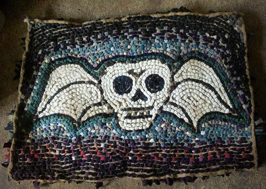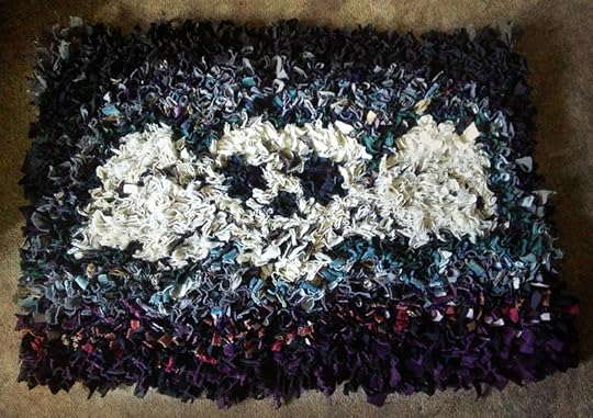 We are preparing for an immersive Hopeless, Maine exhibit this Autumn, and are making sculptures, Painted trays (Hopeless, Maine willow pattern!) and now, this fluffy taste of doom- The gravestone skull rag rug! The design is based on the skull motif found on New England slate gravestones. Nimue has made this because she is a genius and made of gothic win (and dark puppies) Below the back of the rug of doom, as it shows how it was done, and also looks rather like a grim mosaic.