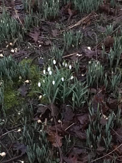 Then, in our little grove, in the midst of a stand of trees past the badger setts, are the first snowdrops. Just one patch, with the rest not quite there yet – but those white heads are here again. They made it.