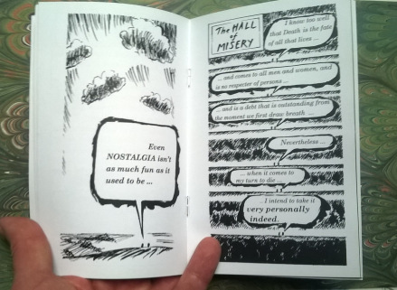 Hall of Misery, by Bill Jones. A small, illustrated text you have to buy directly from Mr Jones, which you can do on his website – or in the streets of Stroud. If you’ve been missing Edward Gorey, this, quite simply, is the book you’ve been waiting for. Dark and funny, making comedy of existential angst and putting it all into perspective. Usually the perspective involves tiny human figures in vast, oppressive landscapes. If you’re still not sure whether this is for you, poke around www.hawkerspot.com until you succumb. I laughed out loud, repeatedly. (And yes, that stalking poem a few weeks back, this is *that* Bill Jones.)