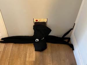 The octopus is also a draft excluder. There was a visible gap under the door and as we head towards winter, that would have been an issue. The upcycled octopus will serve to keep the flat warm and snug, thus cutting down on heating bills and energy use, so he’s a green win on that score, too.