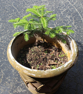 But there's also another tree I'm concerned about. A couple of years ago, my mother noticed a small pine "twig" in one of the containers on her back patio where she planted annuals. She figured a squirrel had buried a pine cone in it, which isn't surprising considering squirrels live in the BIG pine tree in her front yard, and every spring they devour the middle of the pine cones (and mostly eating them on the roof and plugging the front down spout with their leftovers. Ahh, nature).