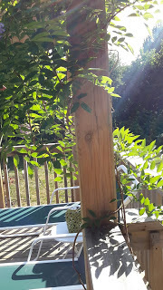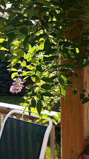 There was no sign of that. More like: Should I call 911 for the poor beleaguered plant? Now in its third year, the wisteria has survived and had a little northern growth spurt and is now moving up in the world. It is outside my bedroom door and the pendulous mauve blooms give me a lift on these June mornings. I love the way it filters the bright morning sun on the little deck.