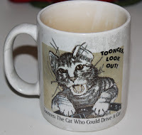 Mr. L and I have an entire cupboard filled with coffee (and for me, tea) mugs. (Okay, except for a few plates that I bought at a yard sale, and maybe a votive candle holder, a couple of plastic glasses, and a jar with some bean seeds.) Some of them we've been drinking out of for nearly 25 years. (It's our big anniversary next month - and if I don't get a BIG CAKE there's going to be hell to pay!!! Just sayin'.)