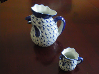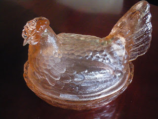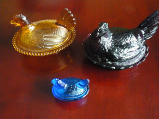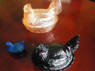 I always loved it and the clear glass turkey that appeared every Thanksgiving and Christmas. They remind me of my mother and of family celebrations. Over the years, I’ve found others at antique fairs and second hand shops. Victoria has given me several as gifts. I treasure them and am always thrilled to let them out for their springtime parade around the house. As you can see, we've diversified into chicken pitchers as well. They were picked up in a sale in a country chuch in England in the spring of 1996. They do like to make an appearance and remind me of that year in the green and leafy U.K.