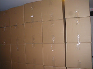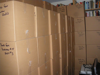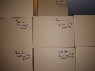 In the morning, a crew sent by the insurance company arrived, a bit later than I would have expected. Apparently, we were not the only ones and we weren’t the worst by a long shot. We had something to be thankful for. Their first job was to pack and label books and stack them in a dry part of the basement. Good thing there was some space where the water hadn't reached. These boxes represent about half the books. All those that were still in a dry place will need to be moved to change the floor.