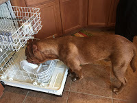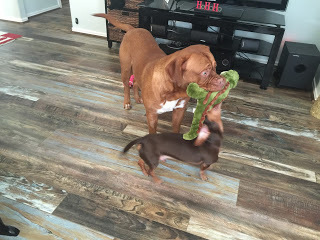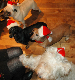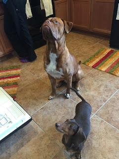 I couldn't resist posting new photos of daughter Serena and S-I-L Jeff's doggies----12 month old French Mastiff "puppy" Boss and Sweet Dachsund Oscar. How better to celebrate the New Year than with beloved pets? My doggies, Katy and Max, and I are celebrating the holidays already with taking it easy every day. :)
