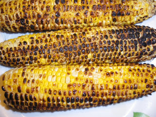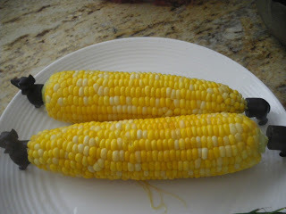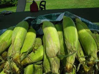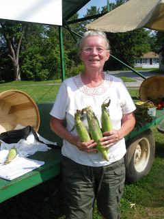 Yesterday my husband and I each picked up a half-dozen ears of corn on our way home. He was walking and I was driving from my appointment. Oh well, you can never have too much.We bought our corn from our friend and neighbor, Anne, who is always reading in (often cozies!) between customers. You gotta love that.