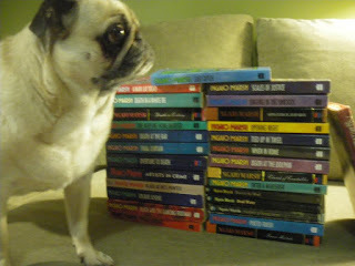 MJ is a lapsed librarian, a former co-owner of Prime Crime Mystery Bookstore in Ottawa and award-winning author of three mystery series: the Camilla MacPhee books, the Fiona Silk comic capers and the Charlotte Adams organizer mysteries. Her miniature dachshunds appear in the Charlotte Adams series. She lives to read and writing the book collector mysteries requiresthat she immerse herself in the work of the Golden Age author chosen for each book. For The Marsh Madness she reread twenty-nine of the thirty-two Ngaio Marsh mysteries. That made her very happy. Here’s the stack of perfect paperbacks that her friend Nancy Reid gave her. Peachy liked them too.