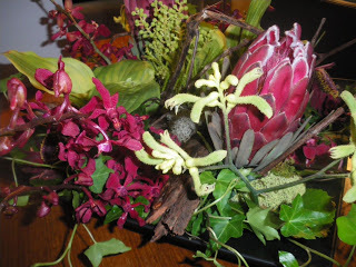 We like flowers too. Here is this years ‘bouquet’: a weird gathering of protea and small orchids, bark, leaves and vines. I’m thinking Star Trek but I love it.