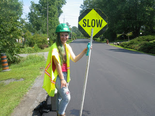 We have learned that the guys with the white hats are the supervisors. My husband has lots of questions for guys in white hats. The men seem to have the ‘fun’ jobs and the young women ‘flagmen’ get the boring job of holding the SLOW and STOP signs and hoping they don’t get flattened in the process. Still, they’ve got pretty good tans and this smiling 'flagman' had long green hair to match her hard hat.